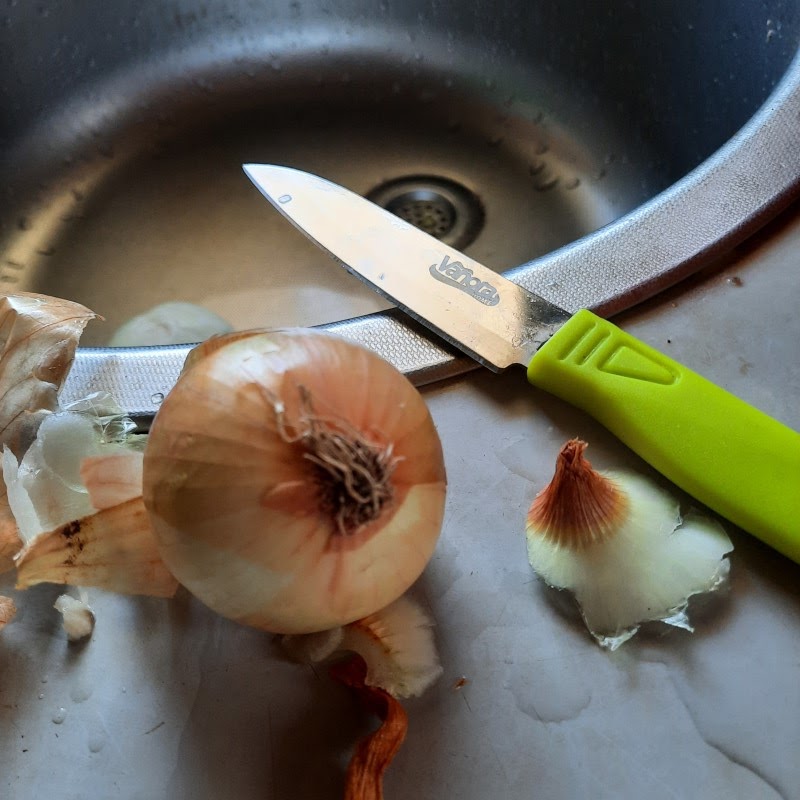 Asa ca ma apuc sa curat ceapa, taind inclusiv si codita, pentru ca le feliez la robot, nu le tai cu cutitul.